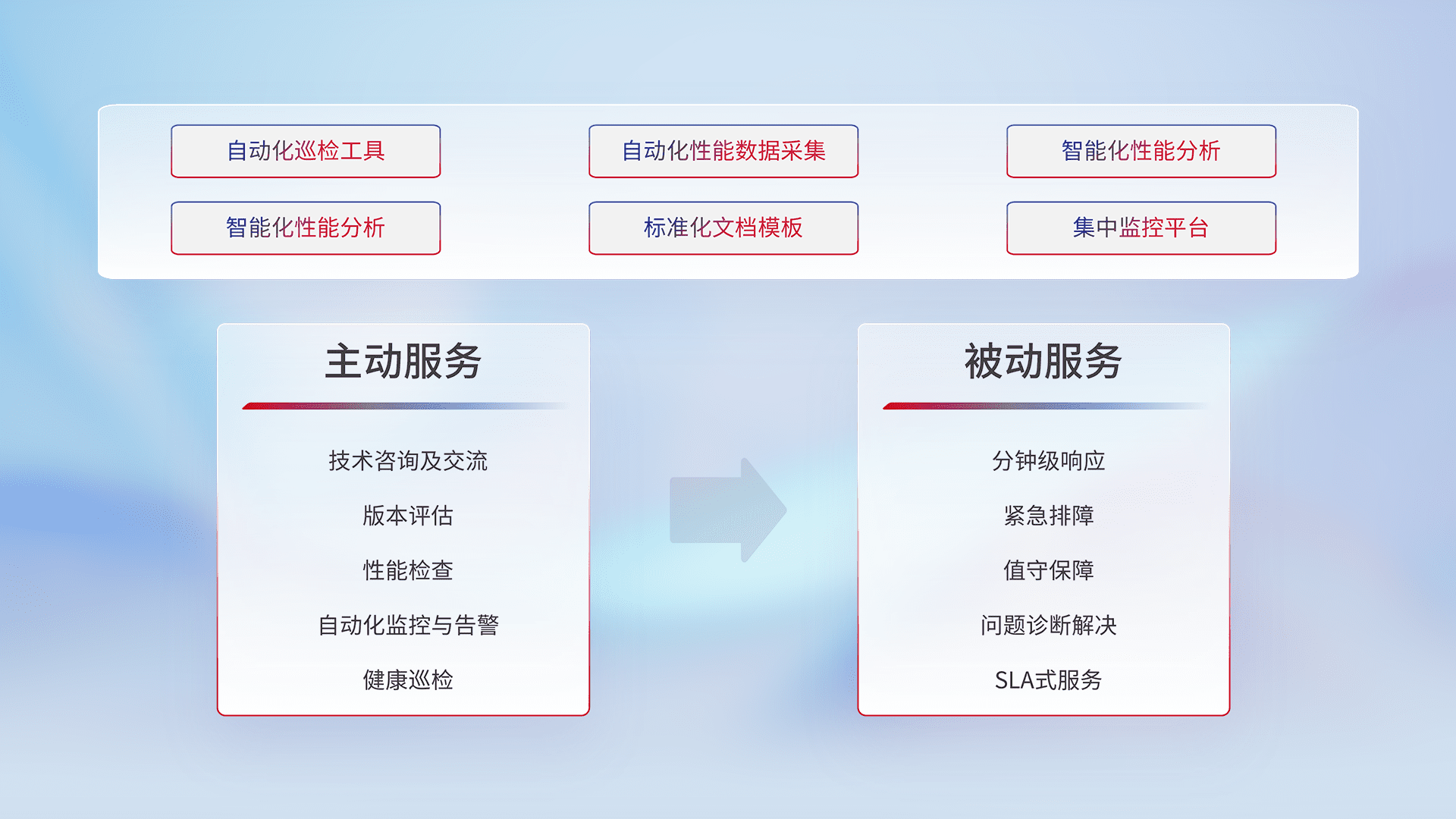 智能化工具和标准化文档,,,,保障服务质量,,,提供主动服务(包含技术咨询、、版本评估、、、、性能检查、、、自动化监控与告警、、健康巡检)和被动服务包含(分钟级响应、、、、紧急排障、、、、值守保障、、、、问题诊断解决、、、、SLA服务)。。