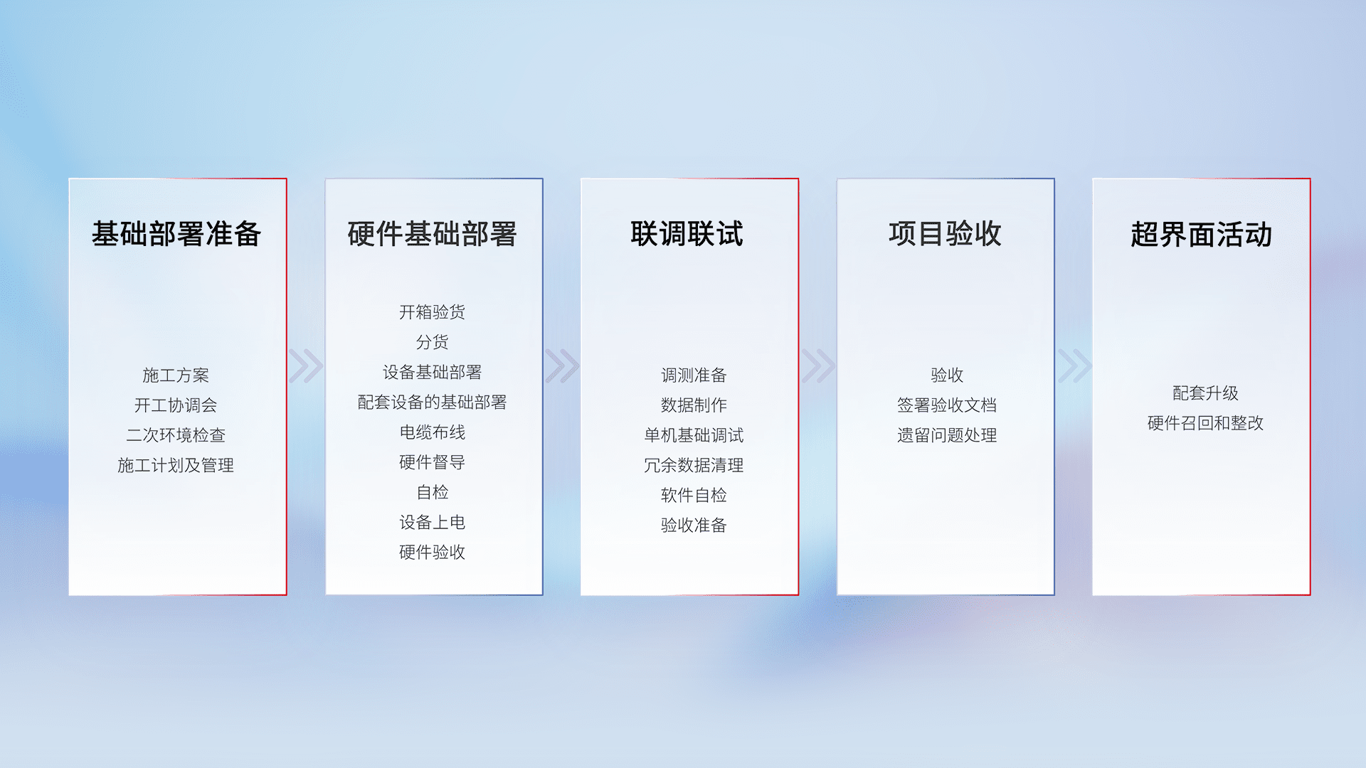 从基础部署准备、、硬件基础部署、、、联调联试、、项目验收、、、越界面活动的全过程可追溯,,,保证施工质量和进度。。